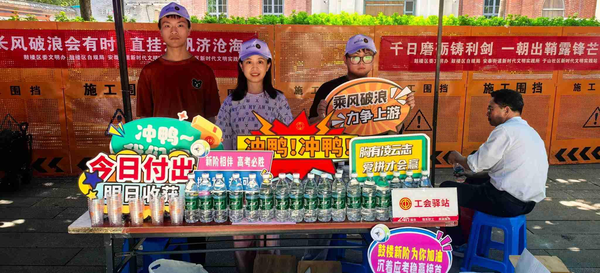 鳌峰坊工会驿站在考点周边设置高考服务点,为考生及家长送上祝福。福州市总工会 供图
